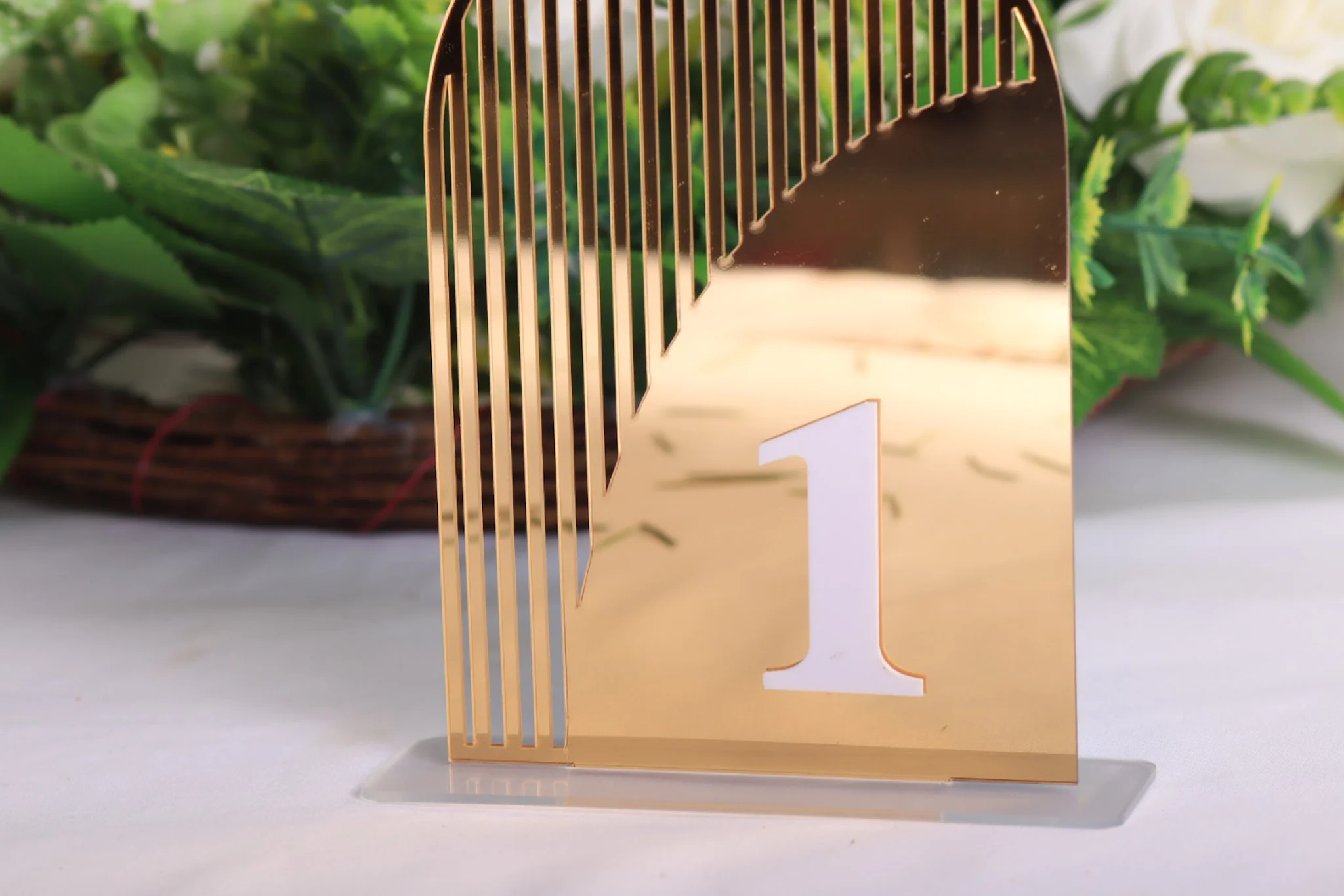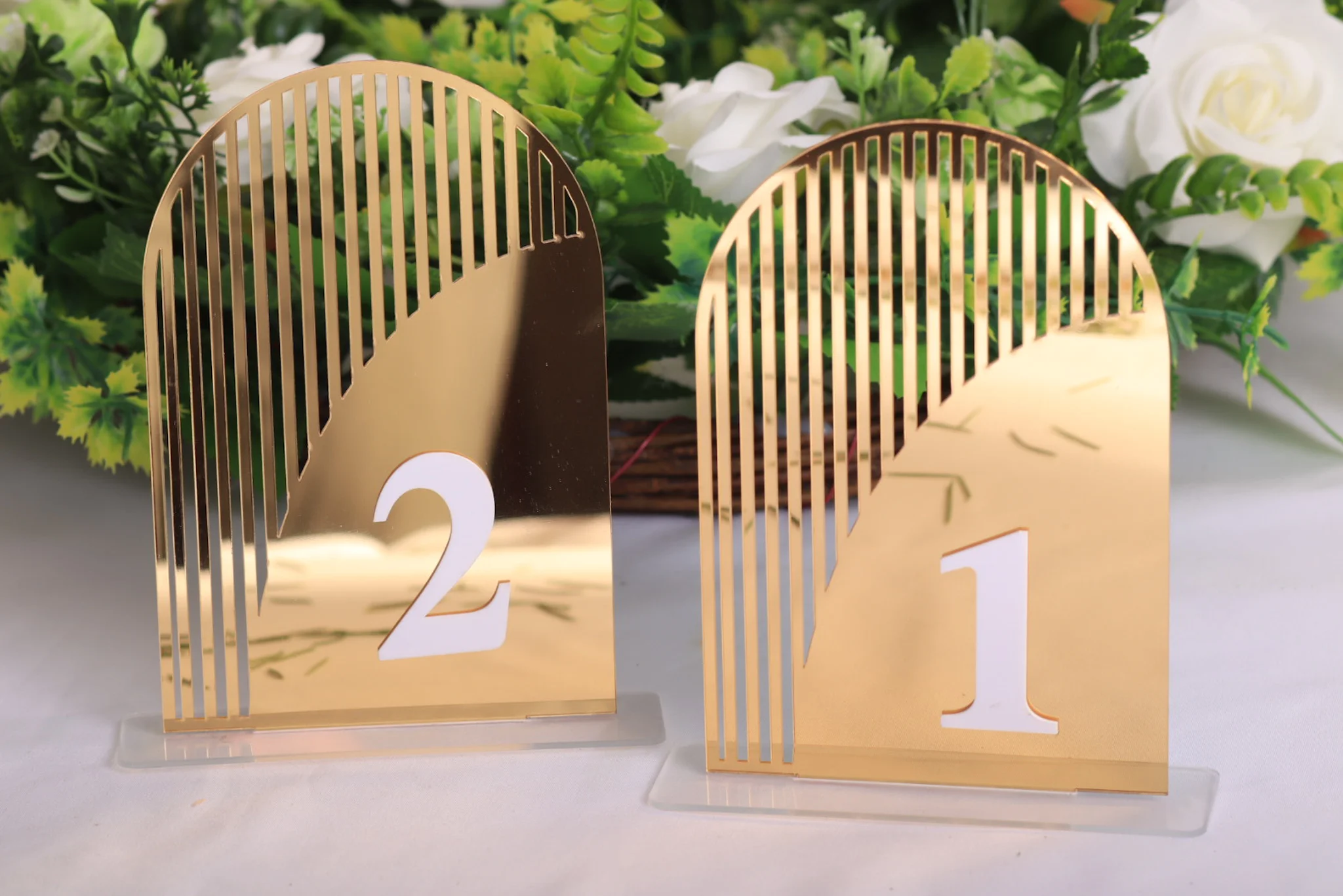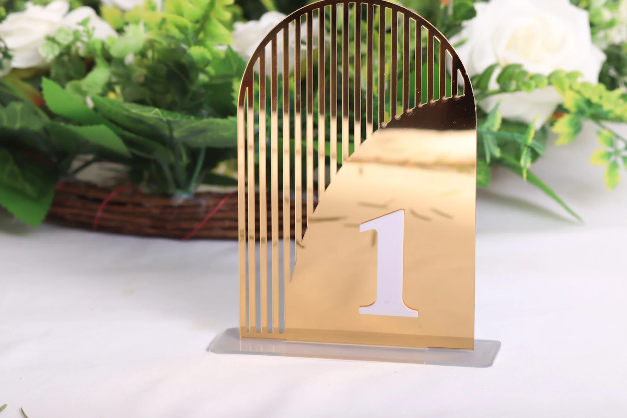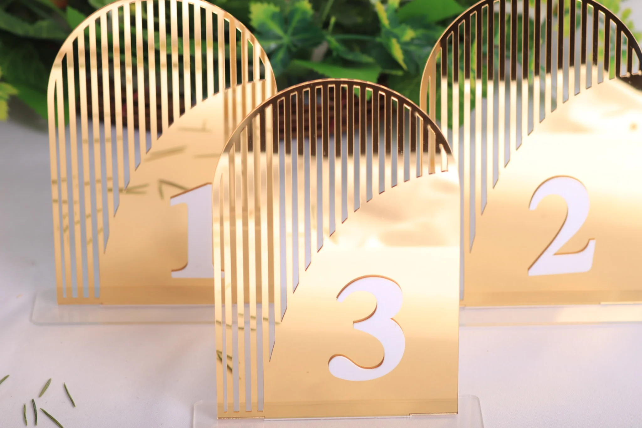 Add a touch of luxury to your wedding tables with our Gold Mirror Acrylic Table Numbers. Designed in a modern arch shape with elegant cut-out detailing, these table signs beautifully catch the light and enhance any wedding theme — from glamorous black-tie celebrations to minimalist modern décor.