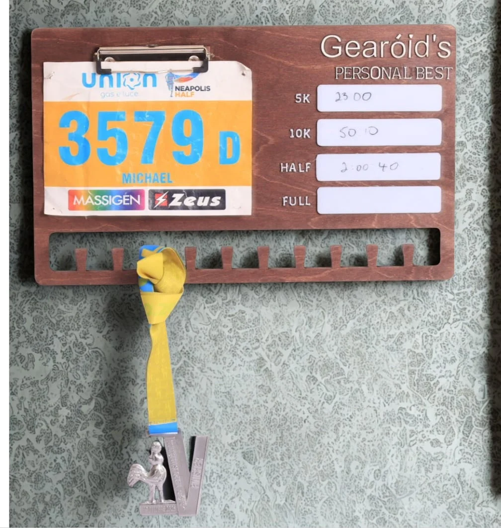 Perfect for 5K runners, marathon finishers, and endurance athletes, this medal holder keeps memories organised while adding a stylish, personal touch to any home gym, hallway, or bedroom.